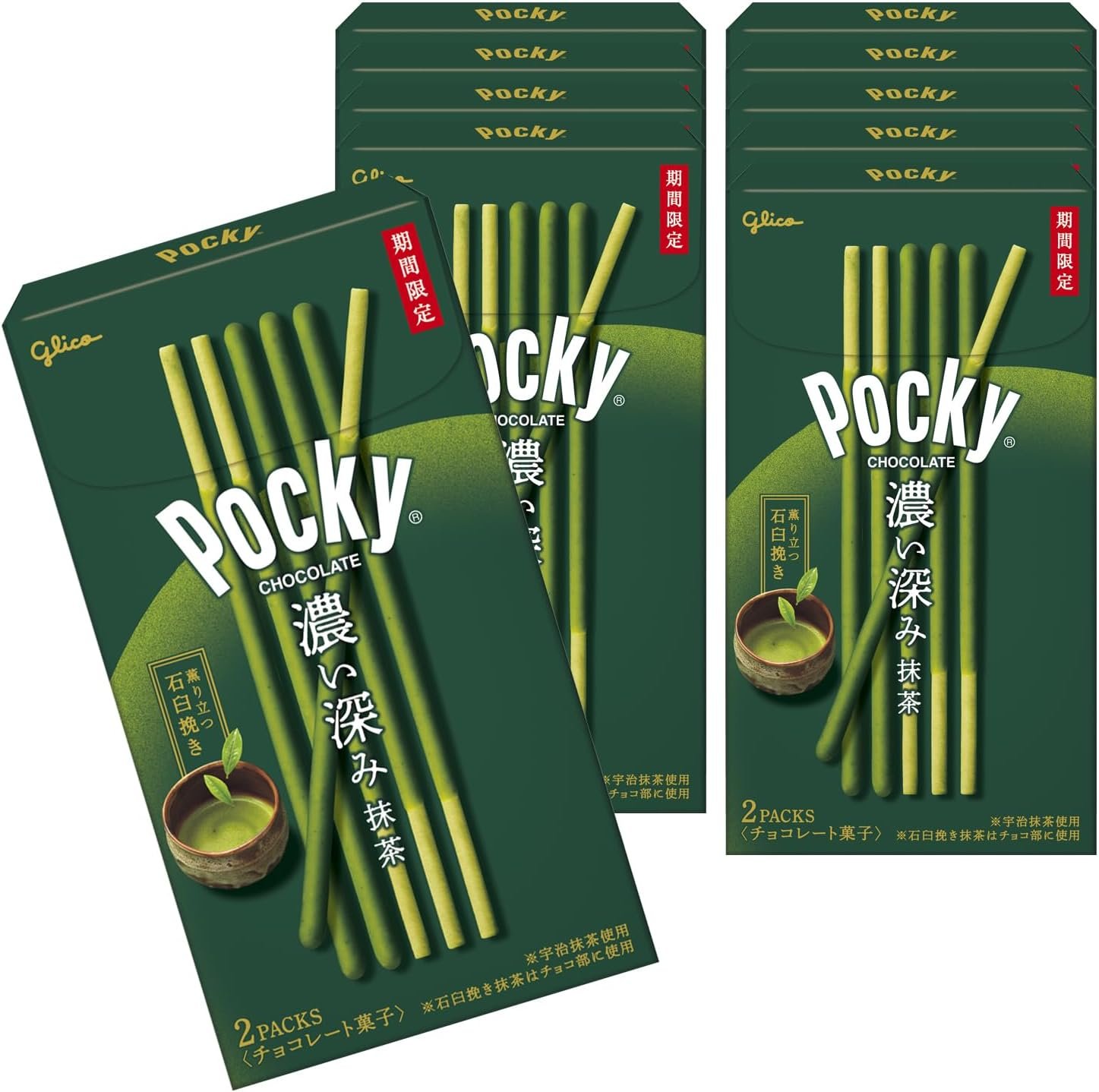 Ezaki Glico Pocky Matcha Sabor Intensamente Suave, Galletas, Chocolate, 2 Bolsas por Paquete, 10 Paquetes”